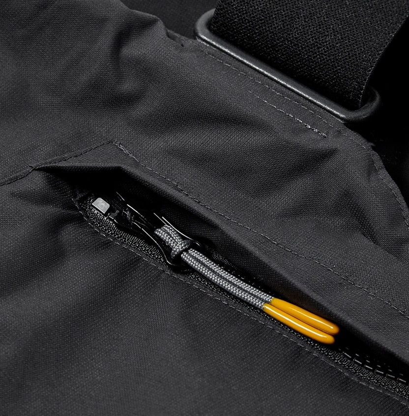 Full length zippered legs protected by a double. Storm guard. Adjustable suspenders for a comfortable fit. External D-ring attachment point. Elastication at waist for improved fit. Large capacity chest pocket with zippered top entry. Performance cut with articulated knees. Abrasion resistant knee panels guard against wear and tear.